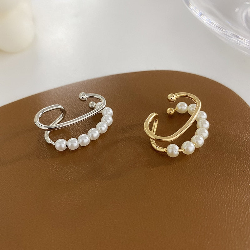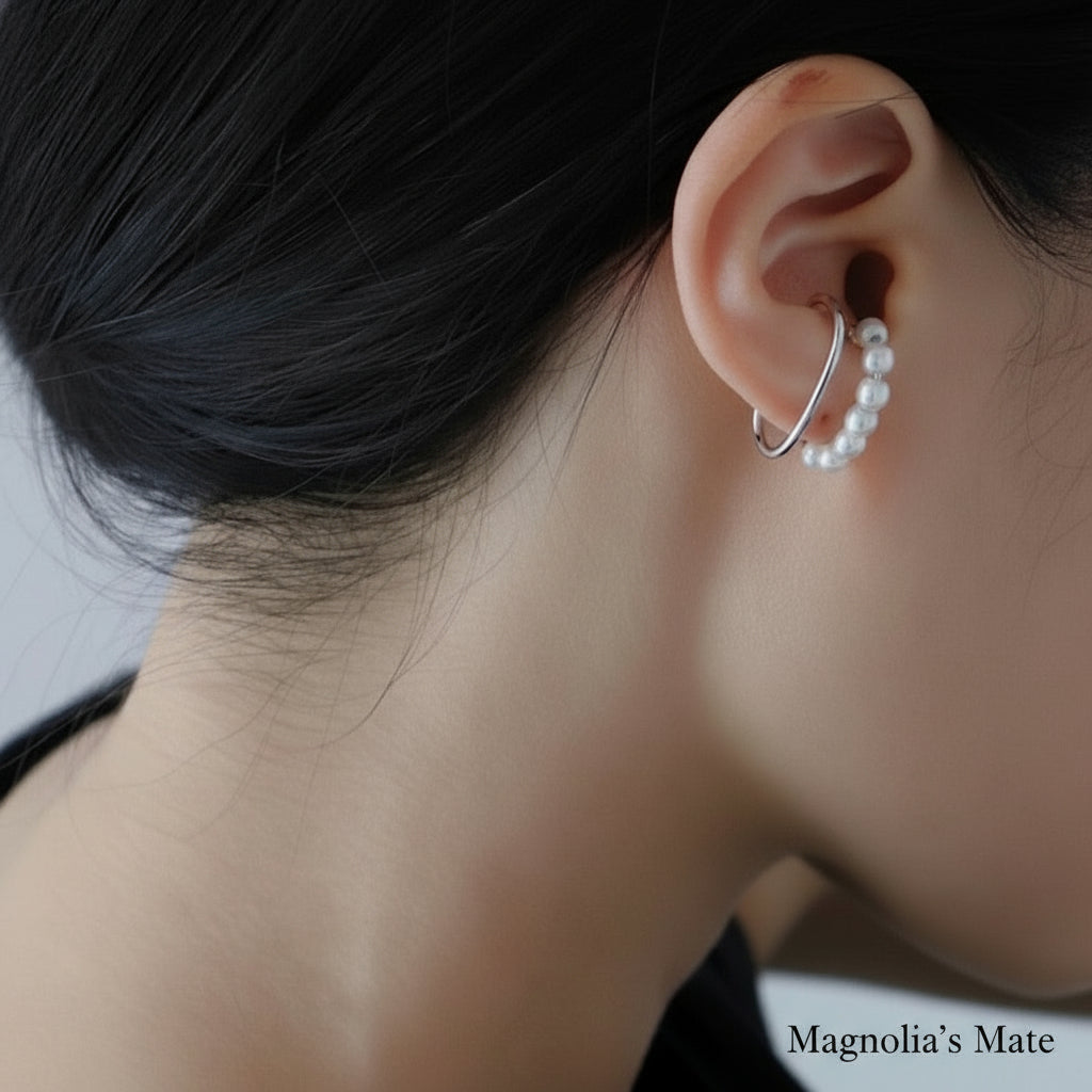 パールとシルバーorゴールドのダブルフープラインが印象的なイヤーカフ。これ1つでコーディネート完成です。