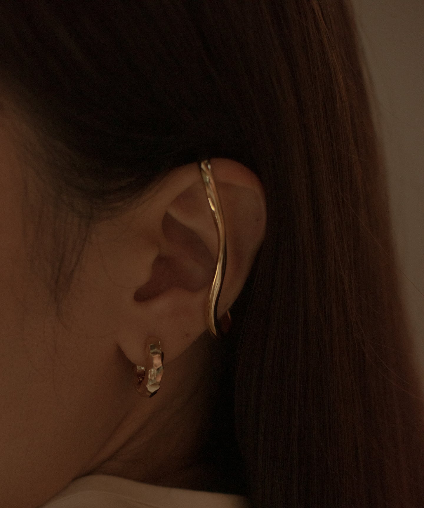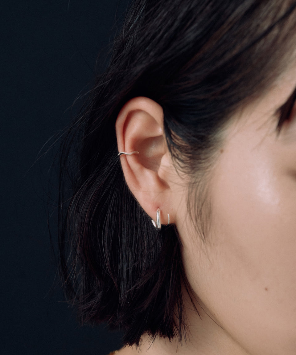 華奢な波型フープのイヤーカフにシンプルな極小フープピアスのコーディネート。異なるサイズのコーディネート。