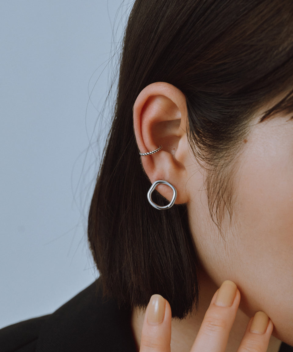 ツイストデザインのイヤーカフ×ねじれたラウンド型のピアスのコーディネート。シルバーでまとめて。