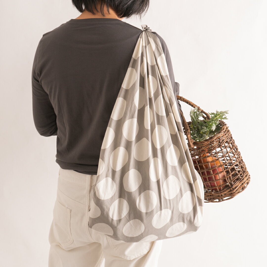 エコバッグに最適なかまわぬの105cmの風呂敷。大胆な幾何学模様がインパクトがありますね。こちらもふろしきパッチン[通常]でショルダーバッグになります。