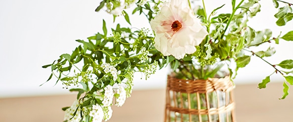 シンプル&普遍的なiittalaティーマの食器にガラス&ラタンのフラワーベース。ガラスとラタンの組み合わせで季節感、高まります。