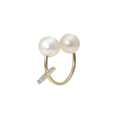 バロックパールイヤーカフ×揺れる一粒パールピアスのコーディネート。サイズの異なるパールが可愛い。