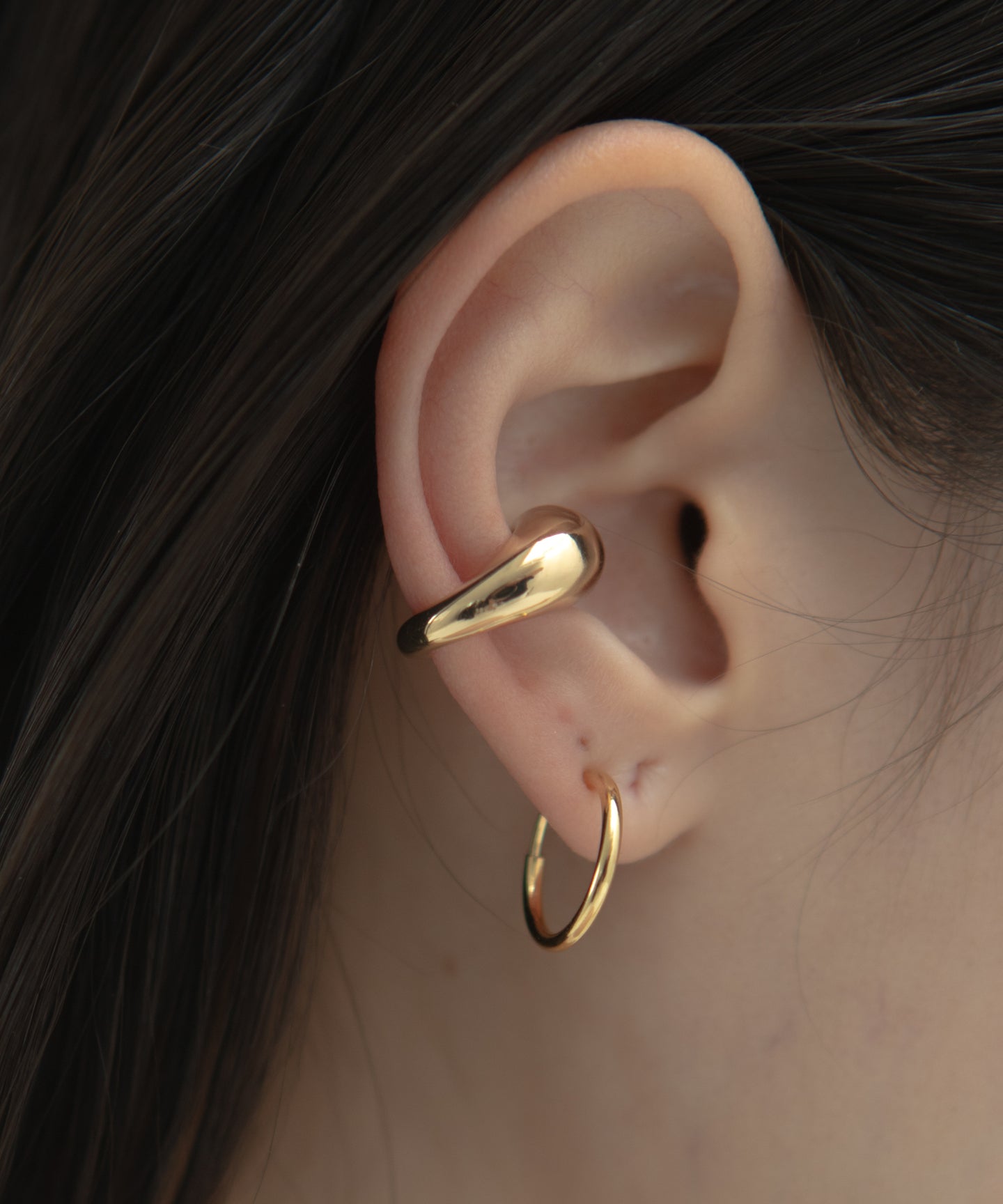 ぽってりとしたドロップ型のイヤーカフに華奢なフープピアスのコーディネート。ゴールドでまとめて。