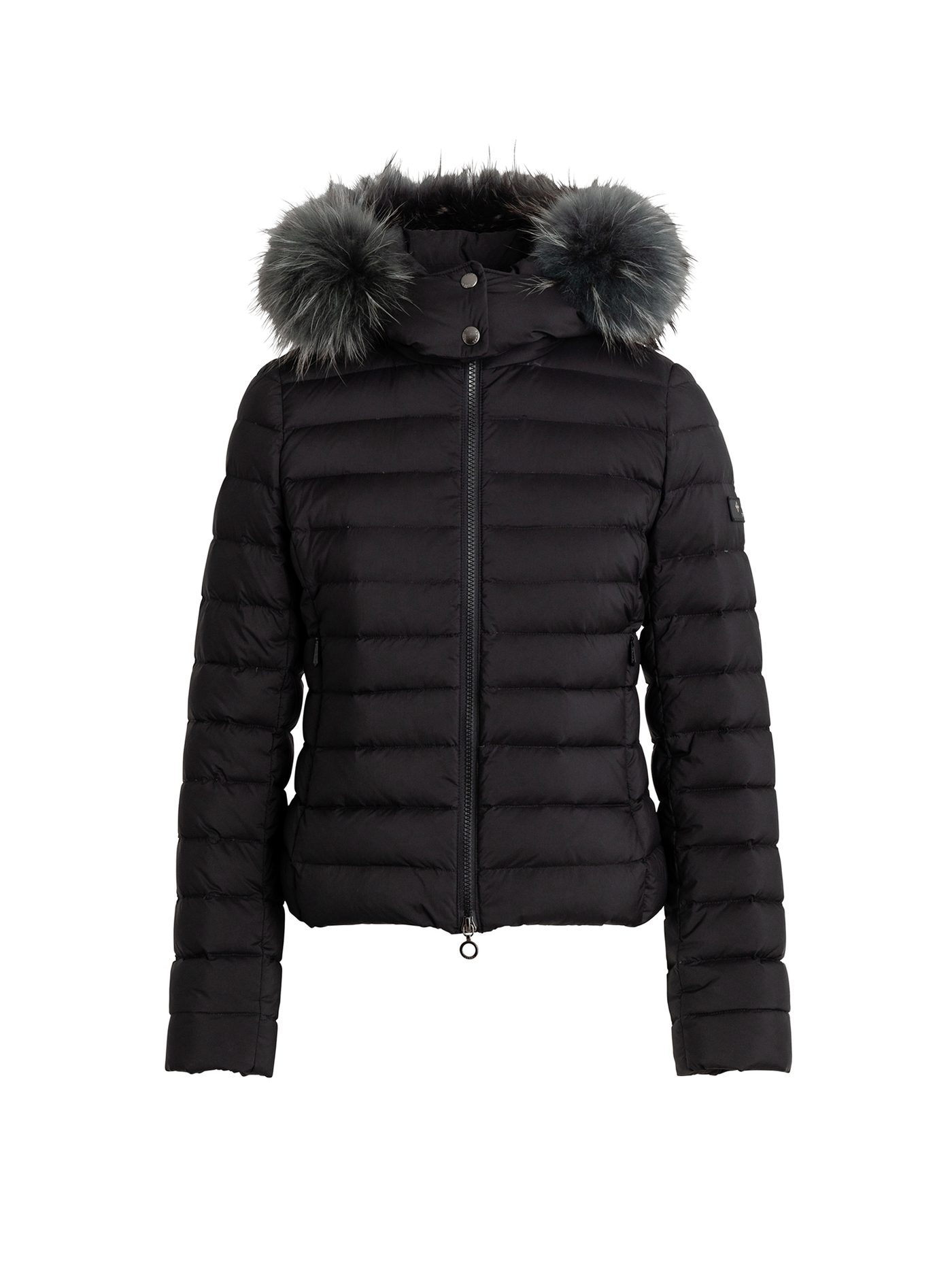 幅の狭いステッチ、すっきりとしたシルエットがポイントのタトラスのショートダウン。フードのファーが華やか。