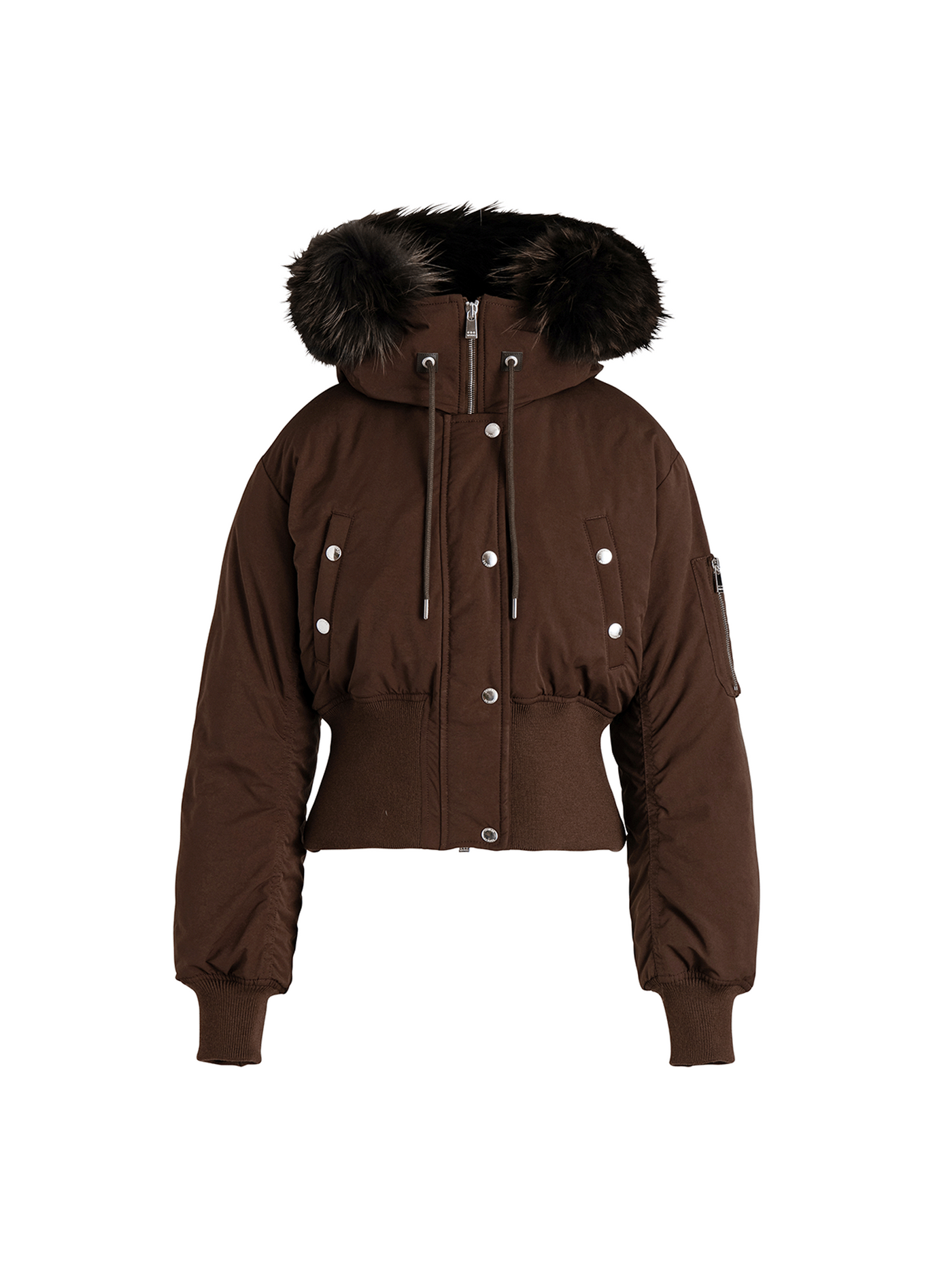 まるでリアルファーのようなリッチな光沢感のエコファーショート丈ダウン。小顔効果のあるスタンドカラーも人気の理由。