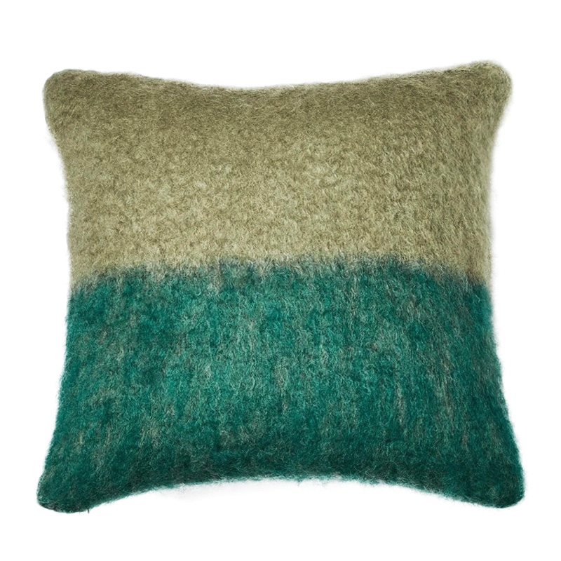 セージ×グリーンのブロックカラーがポップなモヘヤのクッションカバー。なめらかで優しい手触りのモヘヤは冬のインテリアコーディネートのアクセントに。