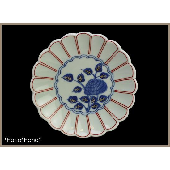 ぱっと花が咲いたようなデザインがおしゃれな「菊割」の豆皿。取り皿として使ったときに引き立つ、赤い花びらがとてもきれいな豆皿は、波佐見焼のもの。