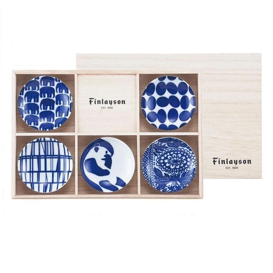 フィンランドのテキスタイルブランド「フィンレイソン」のアウトレット豆皿。白磁に藍色の模様がとてもモダン。木箱入り♡