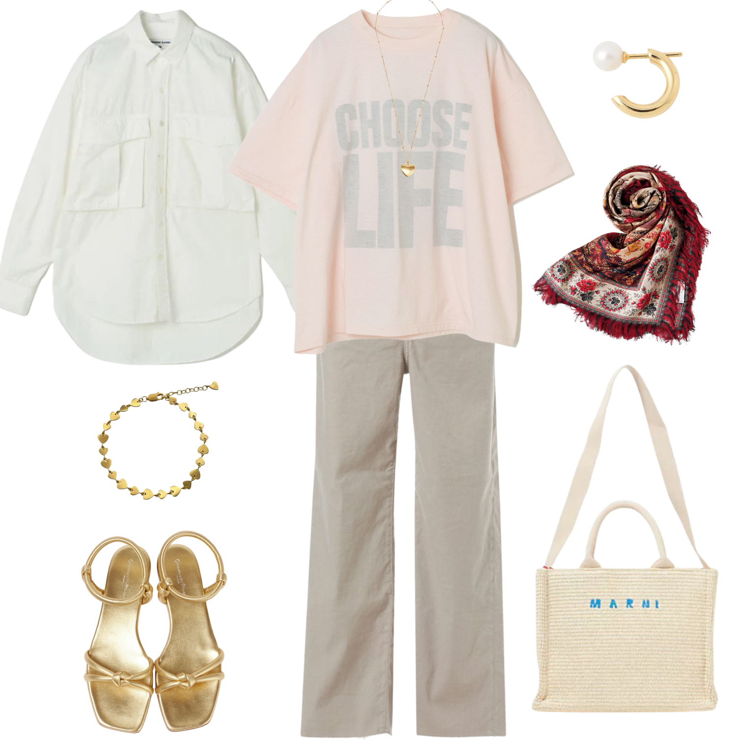 ロゴ入りビッグTシャツに合わせたニュアンスカラーコーデ。素足に馴染む色、ゴールドのストラップサンダルで脚長効果UP。
