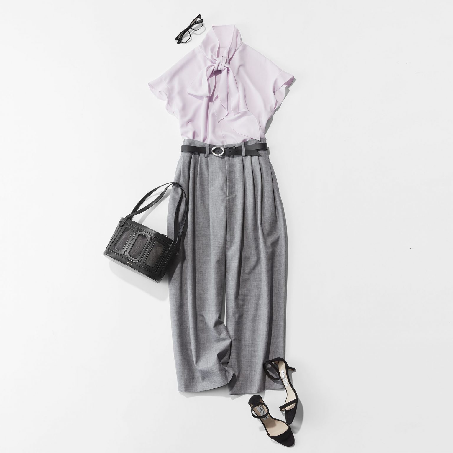 ボウタイブラウス×ワイドパンツに黒のストラップサンダル。クールなきれいめコーデ。