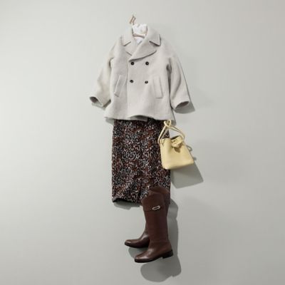 ベージュ&ブラウン系のワントーンコーデにレオパード柄のスカートがアクセント。ふんわりしたコーデがちょっぴりピリ辛に。