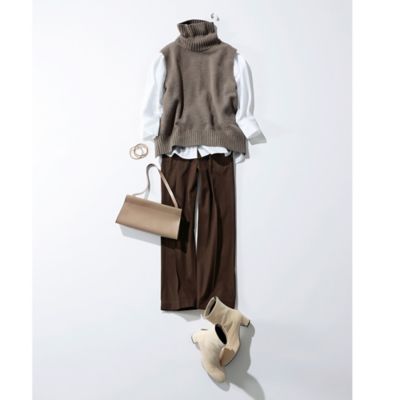 ブラウンのタートルベスト×チノパンツのワントーンコーデ。白シャツをレイヤード。