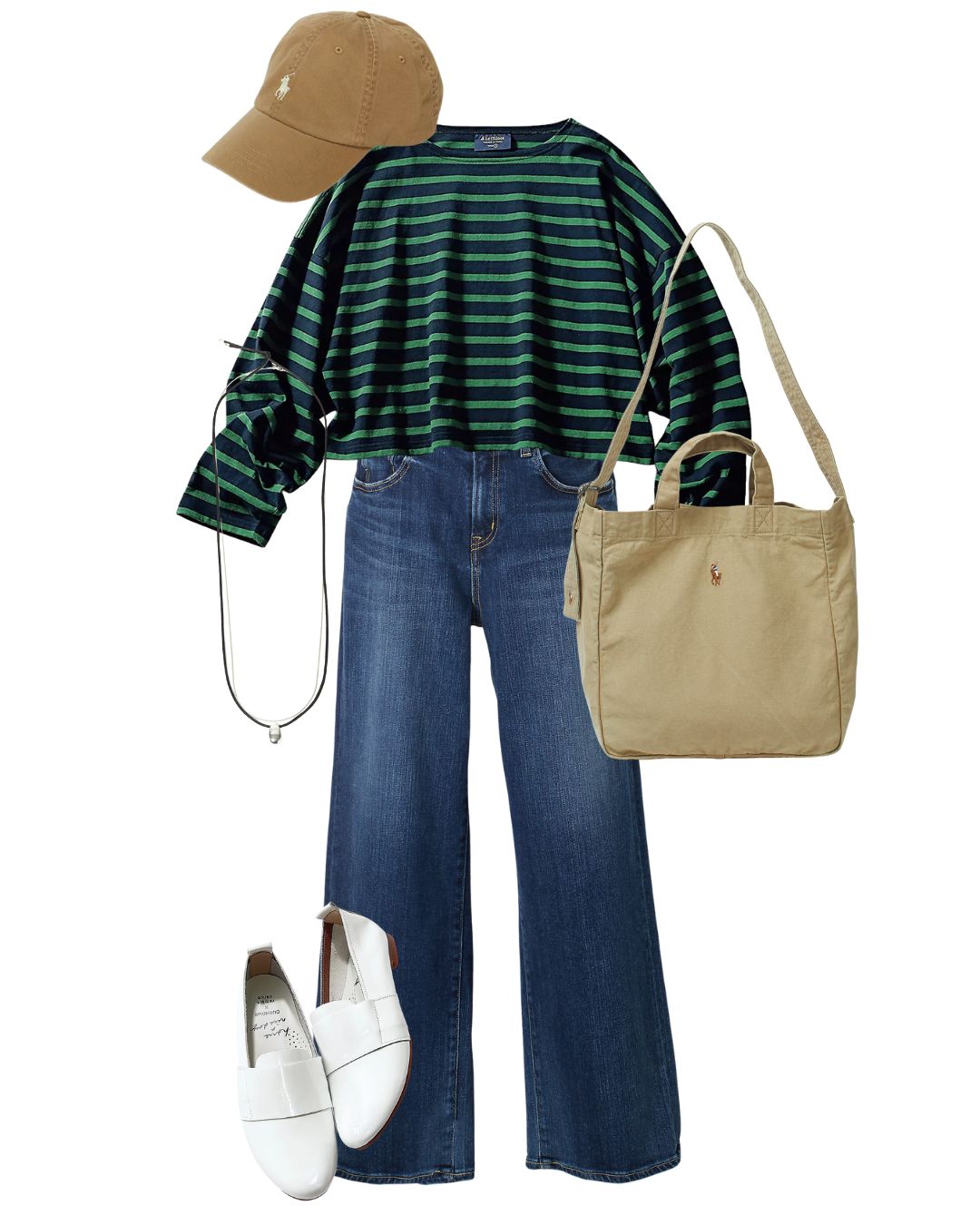 定番中の定番Le MinorのボーダーTシャツ。ボクシーなシルエットが新鮮なロンT。ほんのりワイドなデニムに合わせたきれいめカジュアル。