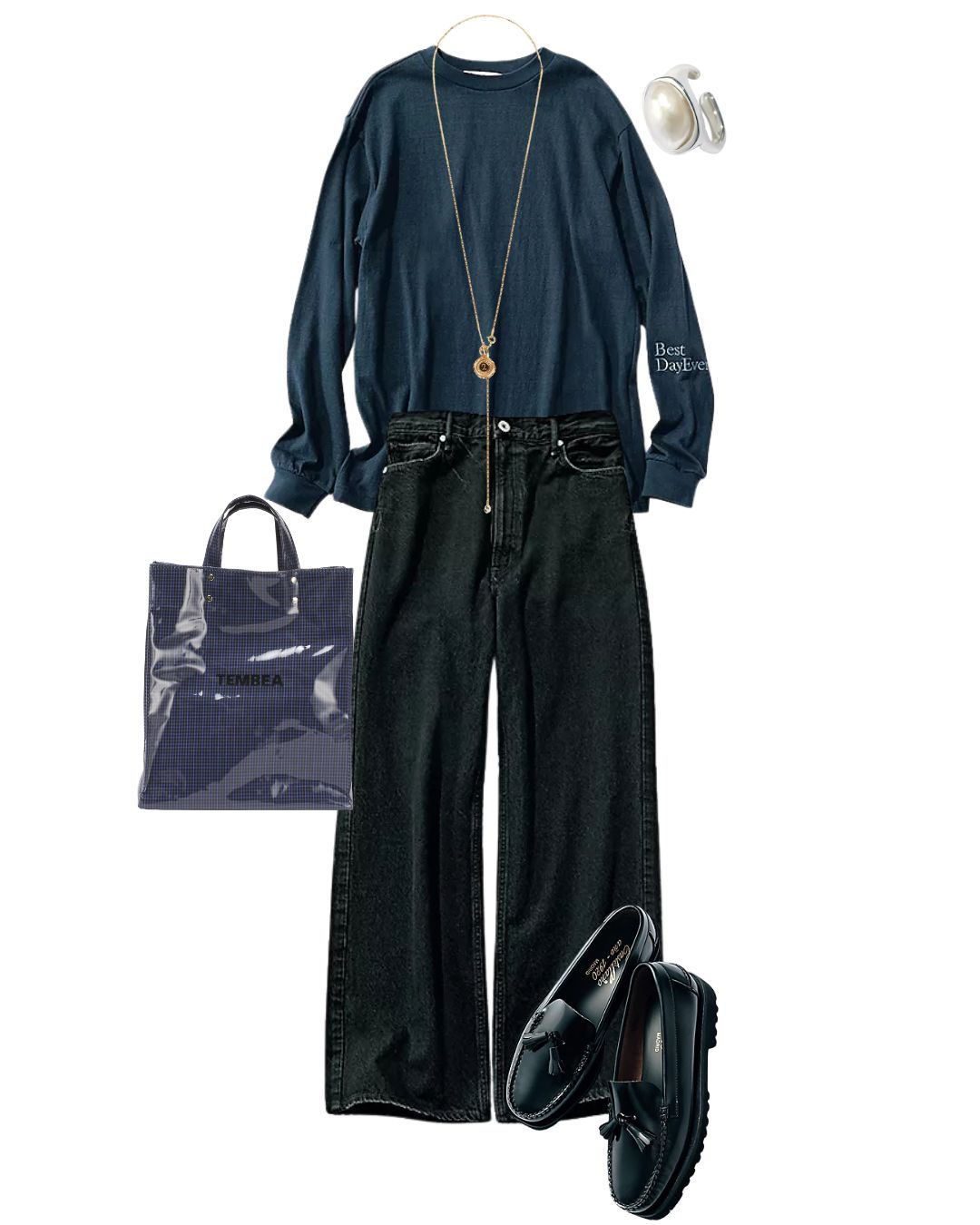 ネイビーのロンTにブラックデニム。ダークカラーのワンツーコーデ。ボリューミーなローファーのバランスが◎。