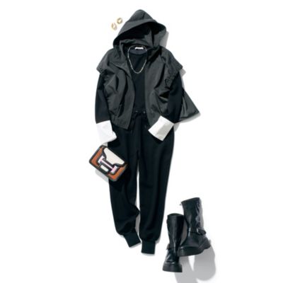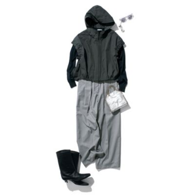 全身黒のきれいめミックスコーデにグレーのフーディージレをレイヤード。メリハリのあるシルエットでおしゃれ見え。袖口の白やボリューブーツも要チェック。