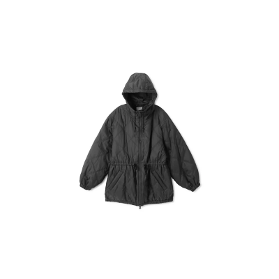 フロントの裾はゴムのシャーリング、バックは長めのラウンドヘム、立ち襟フーディーの立体的なシルエットが可愛いフーディージレ。重ね着すれば、いつものコーデが新鮮に⭐︎