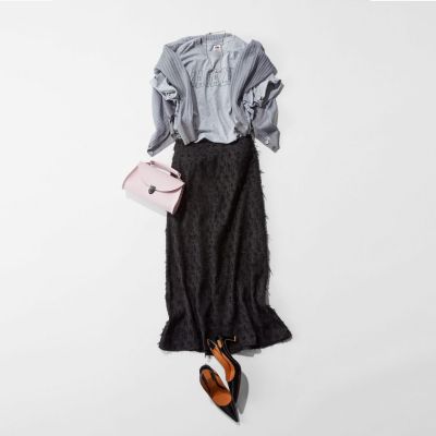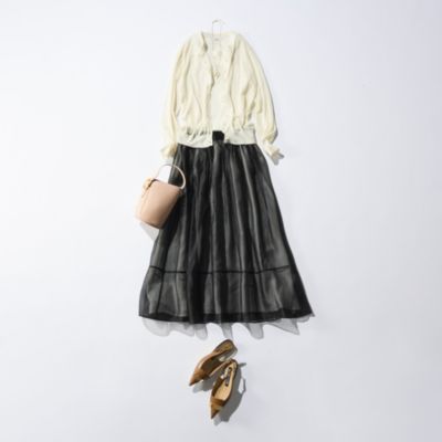 カーディガンの肩掛けも、今季はゆるくがポイント。袖を前で結ぶよりも垂らしてリラクシーに♡