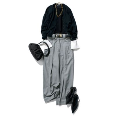 カフス付きプルオーバーにカーディガンを重ね着したモノトーンコーデ。グレーのワイドパンツでマニッシュな仕上がり。