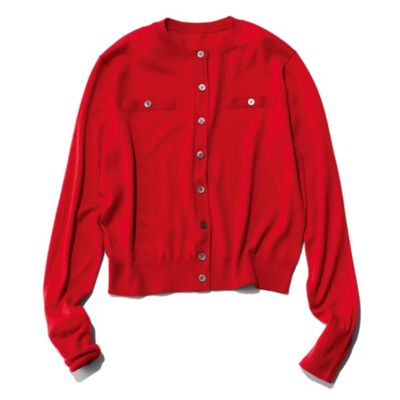 ざっくりとした切りっぱなしのカーディガンに大粒パールボタンが華やかなアイテム。ワイドデニムに合わせて。