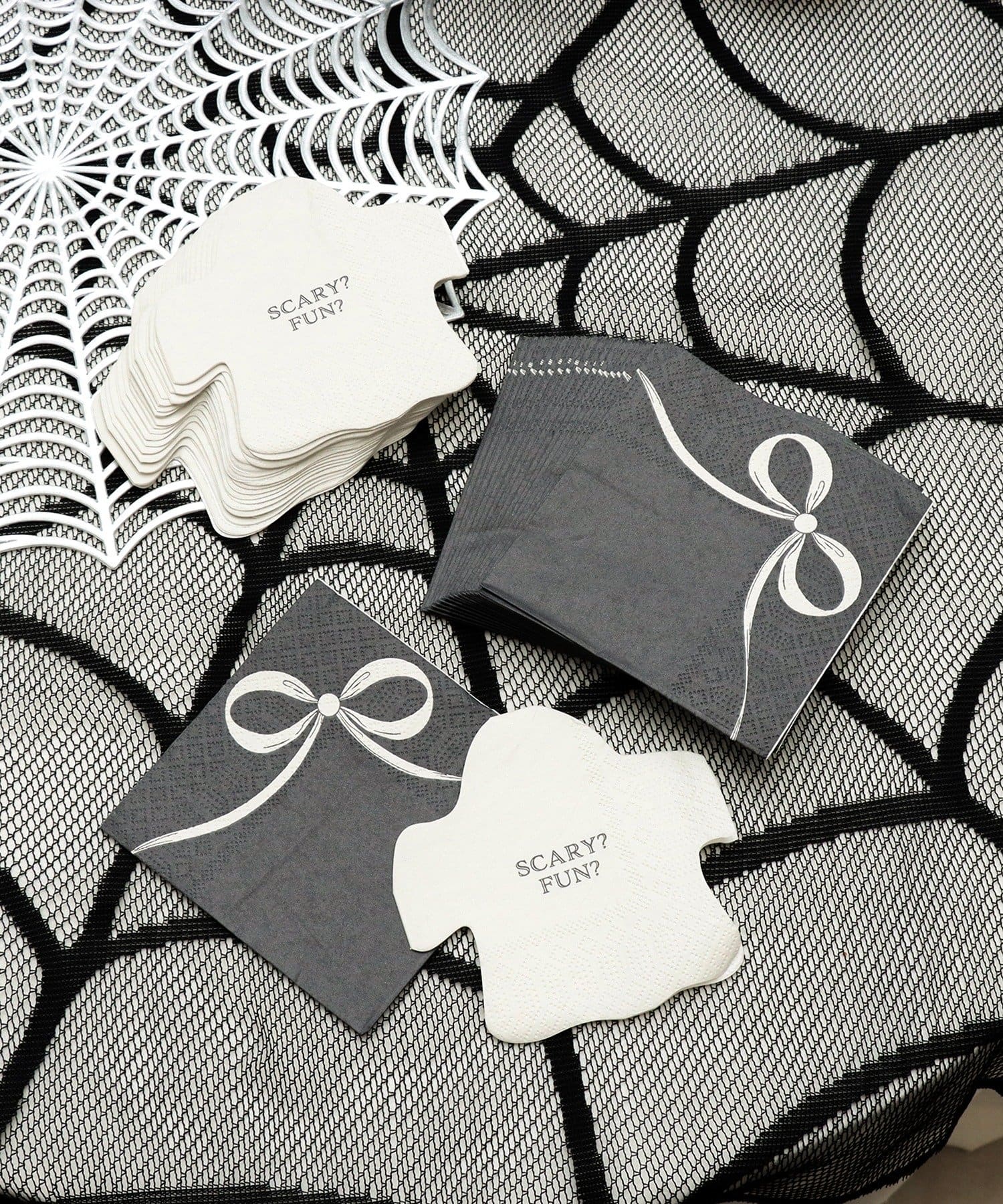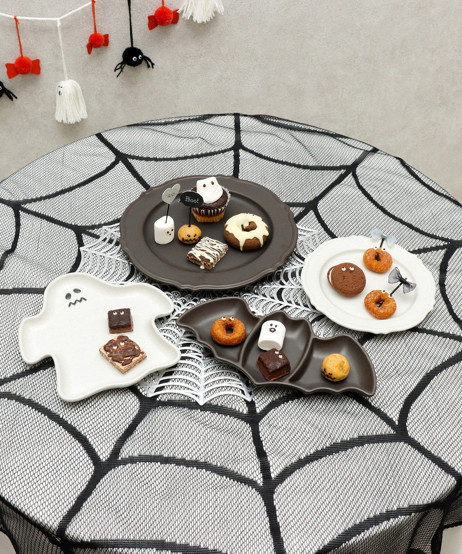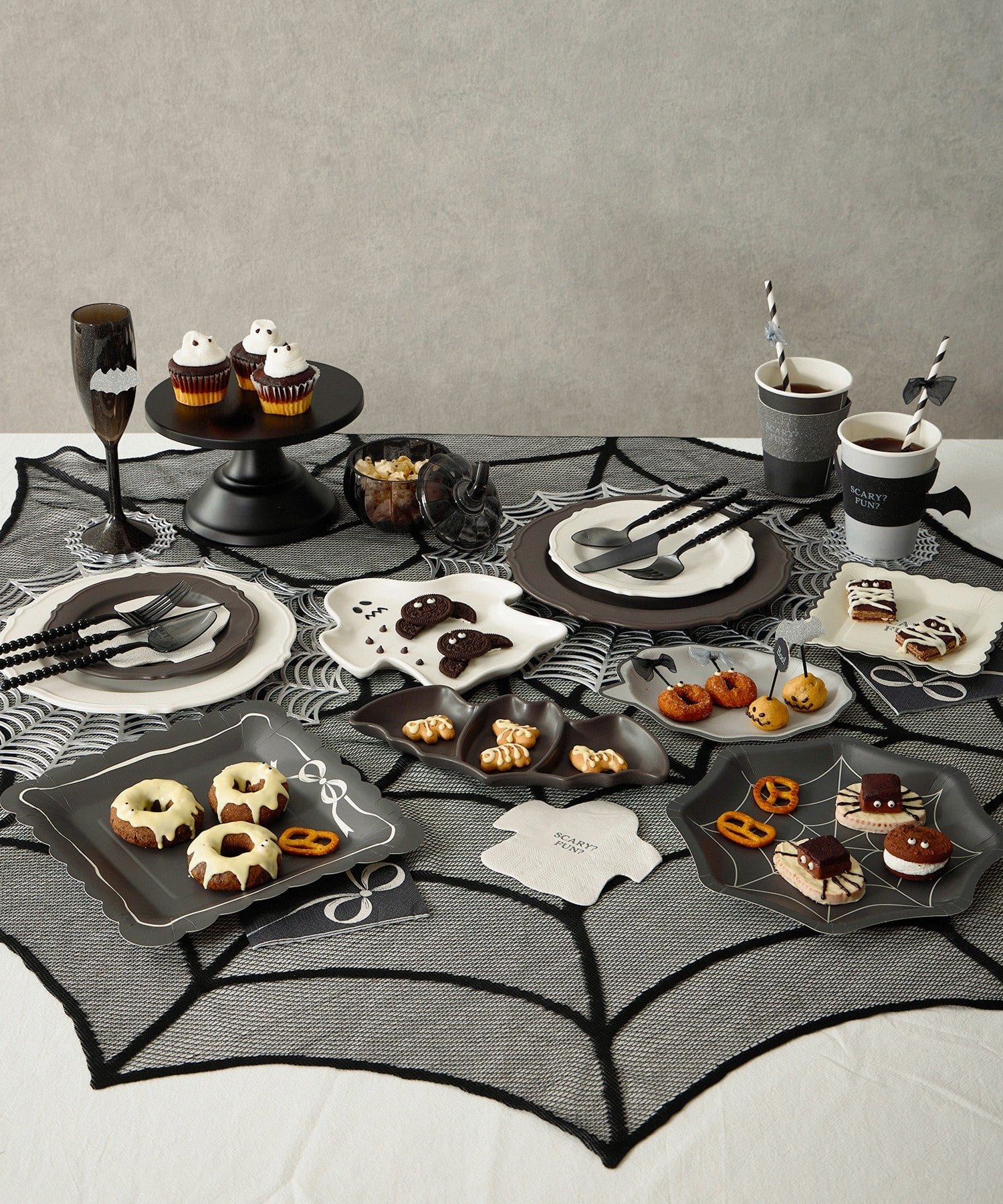 大胆な蜘蛛の巣モチーフのテーブルクロスでぐっと高まるハロウィンムード。洗濯ネットを使用すればお家で洗えます。