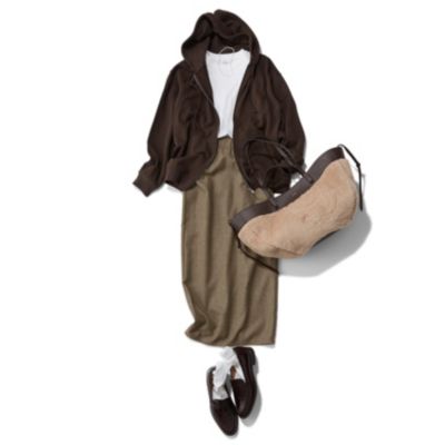 軽いアウターとして便利なパーカーにチェックスカートを合わせたオールブラウンコーデ。インナーの白Tシャツでクリーンに。