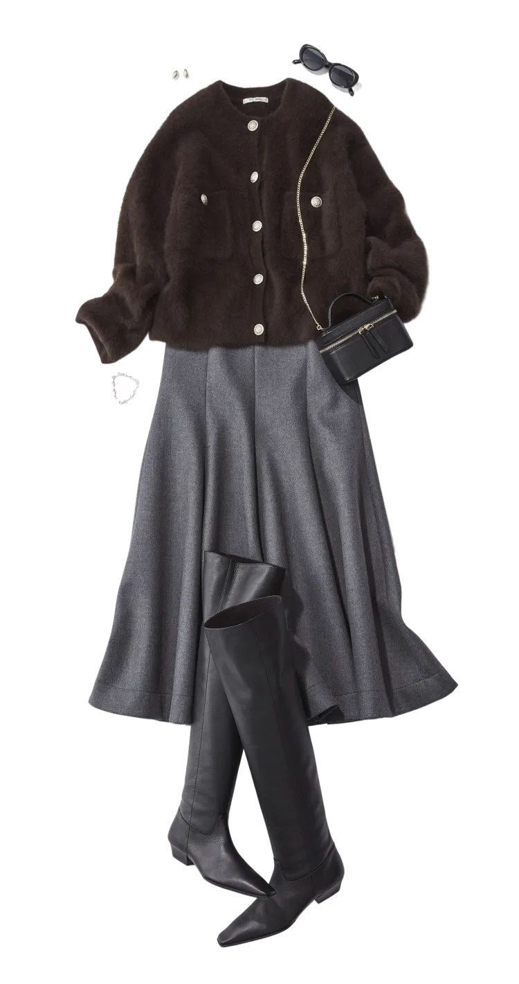 ふんわりとした長い毛足が可愛いWhim Gazetteのブラウンニットジャケット×フレアスカートの秋冬コーデ。細身のロングブーツですらり見え。