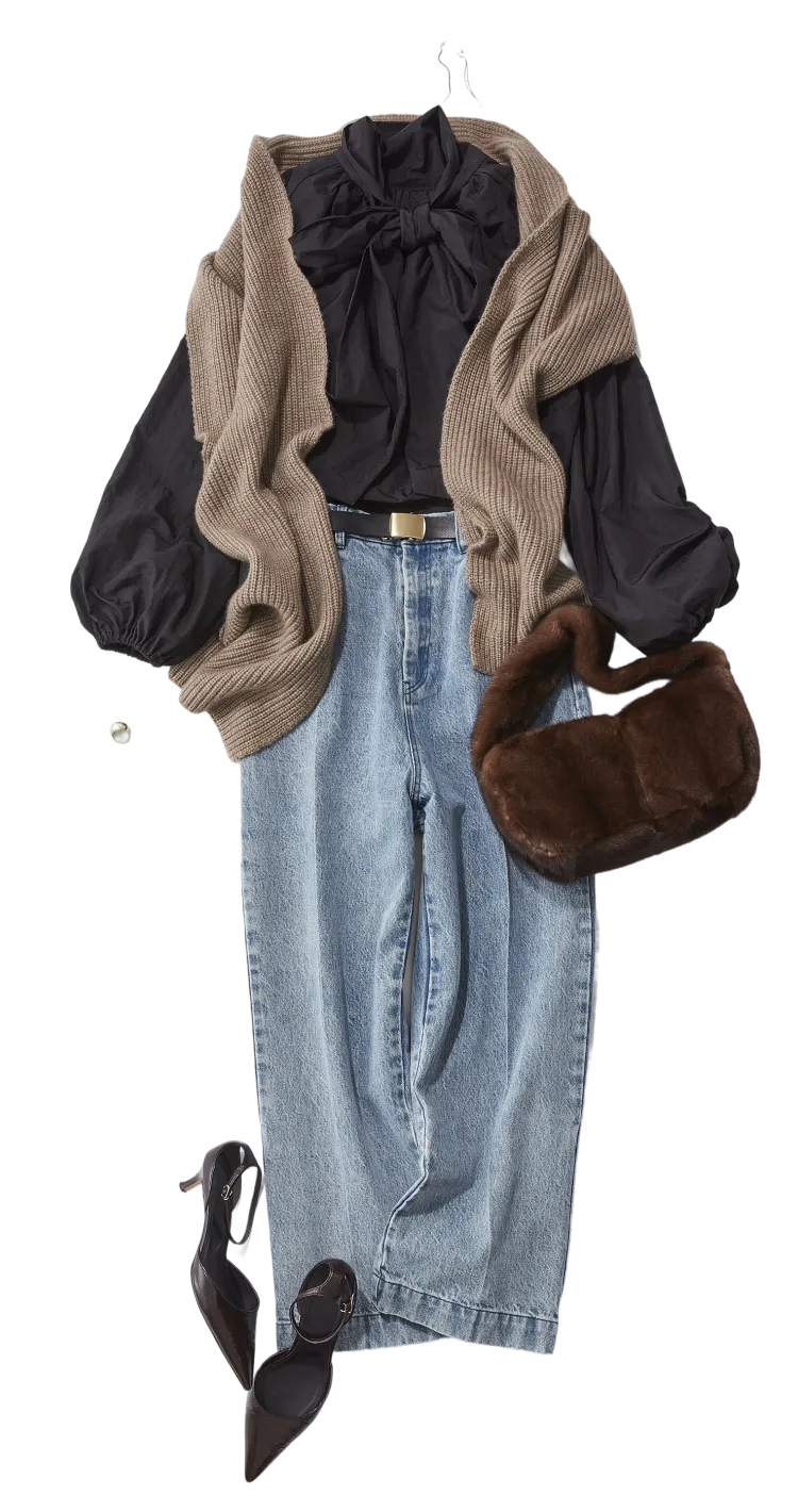 黒いボウタイブラウス×淡色デニムにWhim Gazetteのカシミヤリブストールをオン⭐︎こっくりとしたモカブラウンがシーズンムードを高めます。