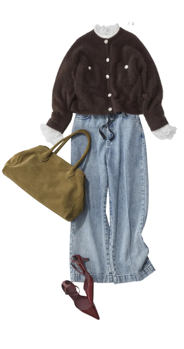 ブラウンニットジャケット×淡色デニム。インナーのフリルブラウスの白が効いてます⭐︎