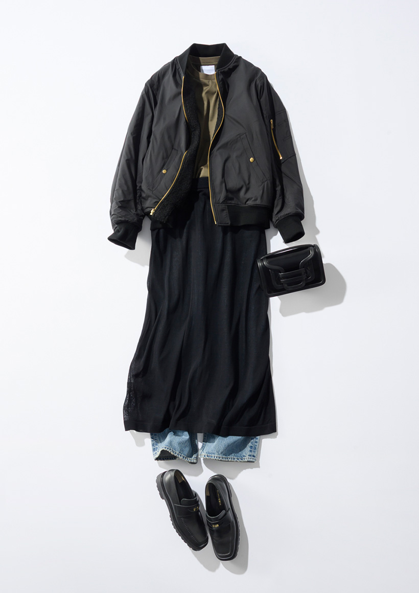 シアースカートをデニムにレイヤードしたミックスコーデ。ボリューム感がかわいい黒いMA-1を合わせて。