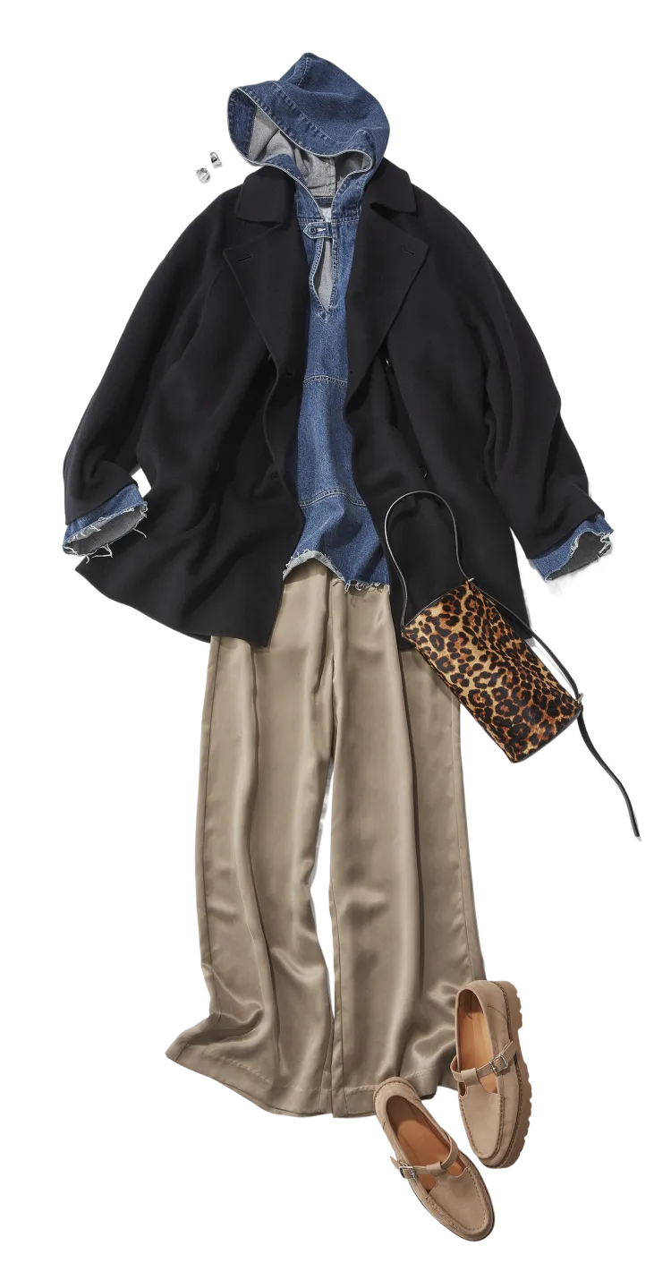 デニムパーカー×とろみパンツのリラックスコーデに黒いリバーPコート。シンプルな無地コーデにはレオパード柄のバッグがアクセント。