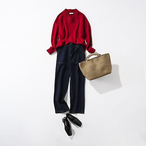 カシミヤ混の赤いVネックニットに濃紺デニムをコーディネート。イントレチャートがポイントのキャメルバッグが季節感を高めます。
