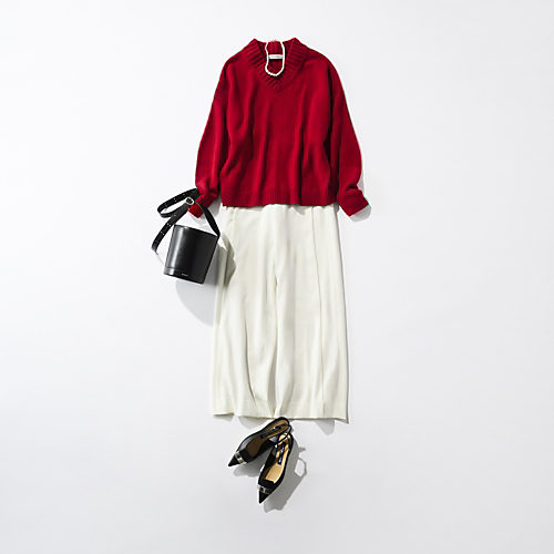 鮮やかな赤いVネクニット×白いワイドパンツを合わせたきれいめコーデ。Sergio Rossiのシューズで格上げ⭐︎