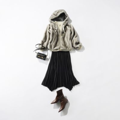 HERNOの大ヒットアイテム、エコファーブルゾン。モノトーンのスカートコーデにライトグレーのブルゾンで明るく。
