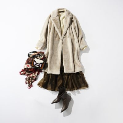 シアー感&ボリューム感が華やかなオーガンジースカートにベージュのファーコートを合わせたフェミニンコーデ。マルチカラーバッグ&プリントストールがアクセント。