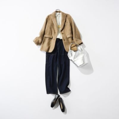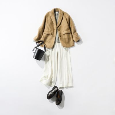 光沢感のあるふんわりとしたシャギー素材が特徴のコートジャケット。白のワイドパンツできれいめに。