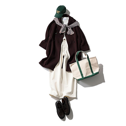 今季のトレンドカラー、ブラウンのチェスターコート×ホワイトデニムのカジュアルコーデ。キャップやトートバッグのグリーンが効いてます⭐︎