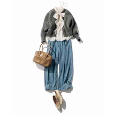 アイボリーのボウタイブラウスをパールボタンカーディガンに重ね着。ワイドデニムコーデをフェミニンに。