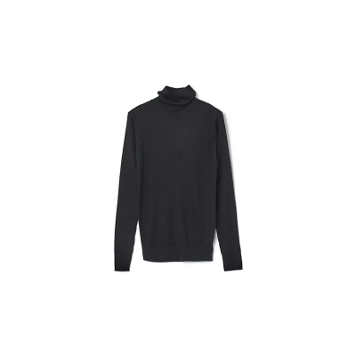 立体感のある異素材全身黒コーデ。タートルネックニットにロングネックレスで作るVゾーンの効果で、顔まわりすっきり見え。ダークコーデに抜け感をもたらすチュールスカート。