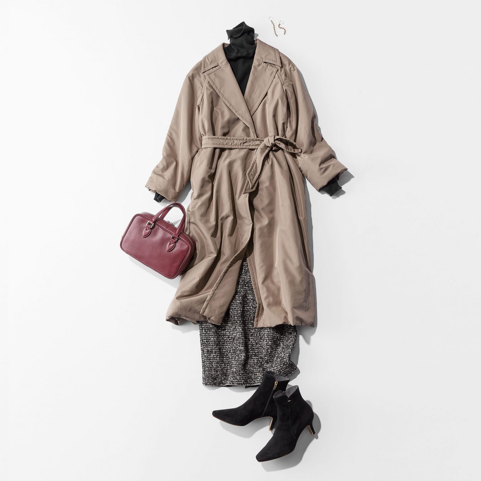 タートルネック×ヘリンボーンタイトスカートのモノトーンコーデ。トレンドカラー、茶色のコートで柔らかい雰囲気。