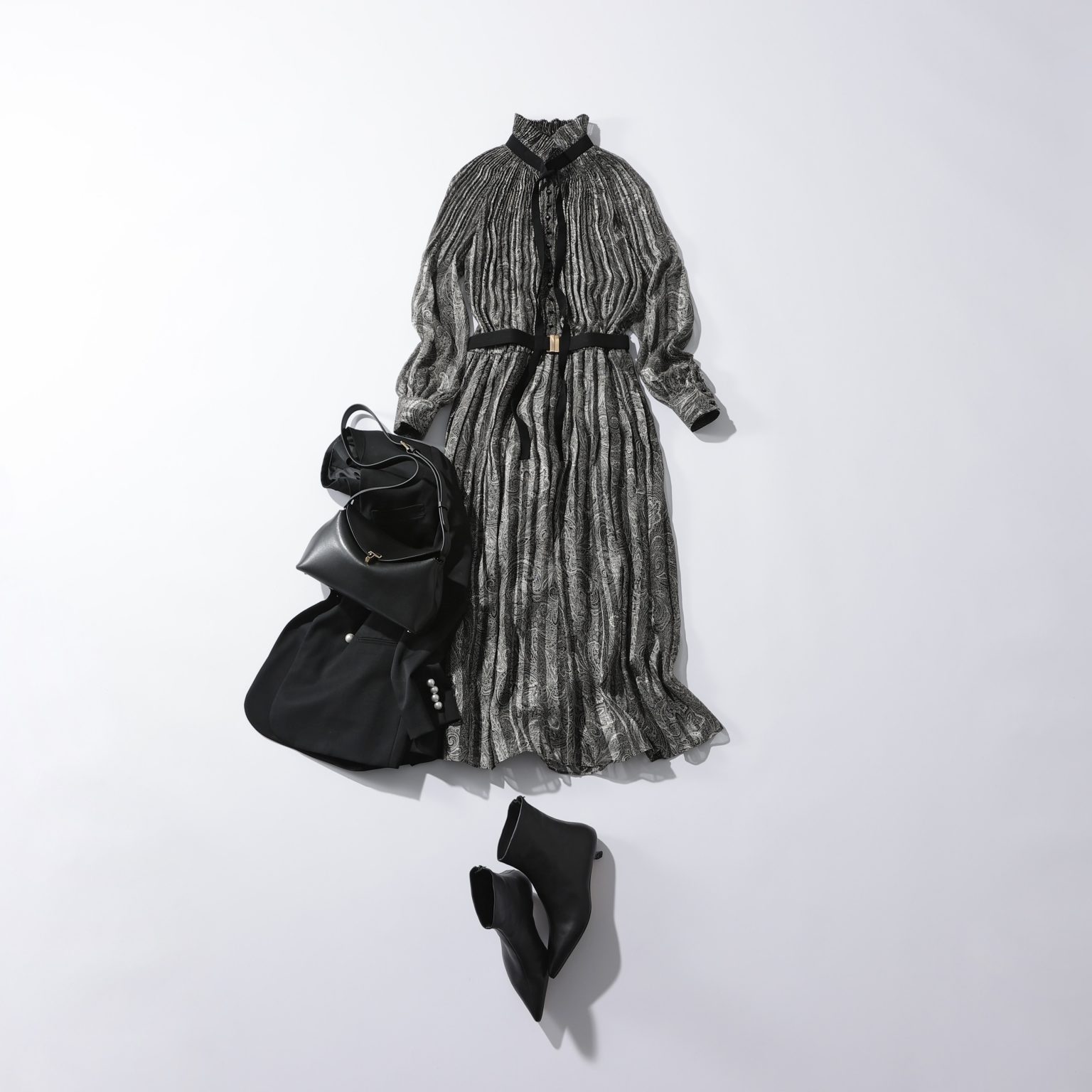 光沢感と透け感が上品なプリントワンピースの全身黒コーデ。ポインテッドトゥのショートブーツでシャープに♡