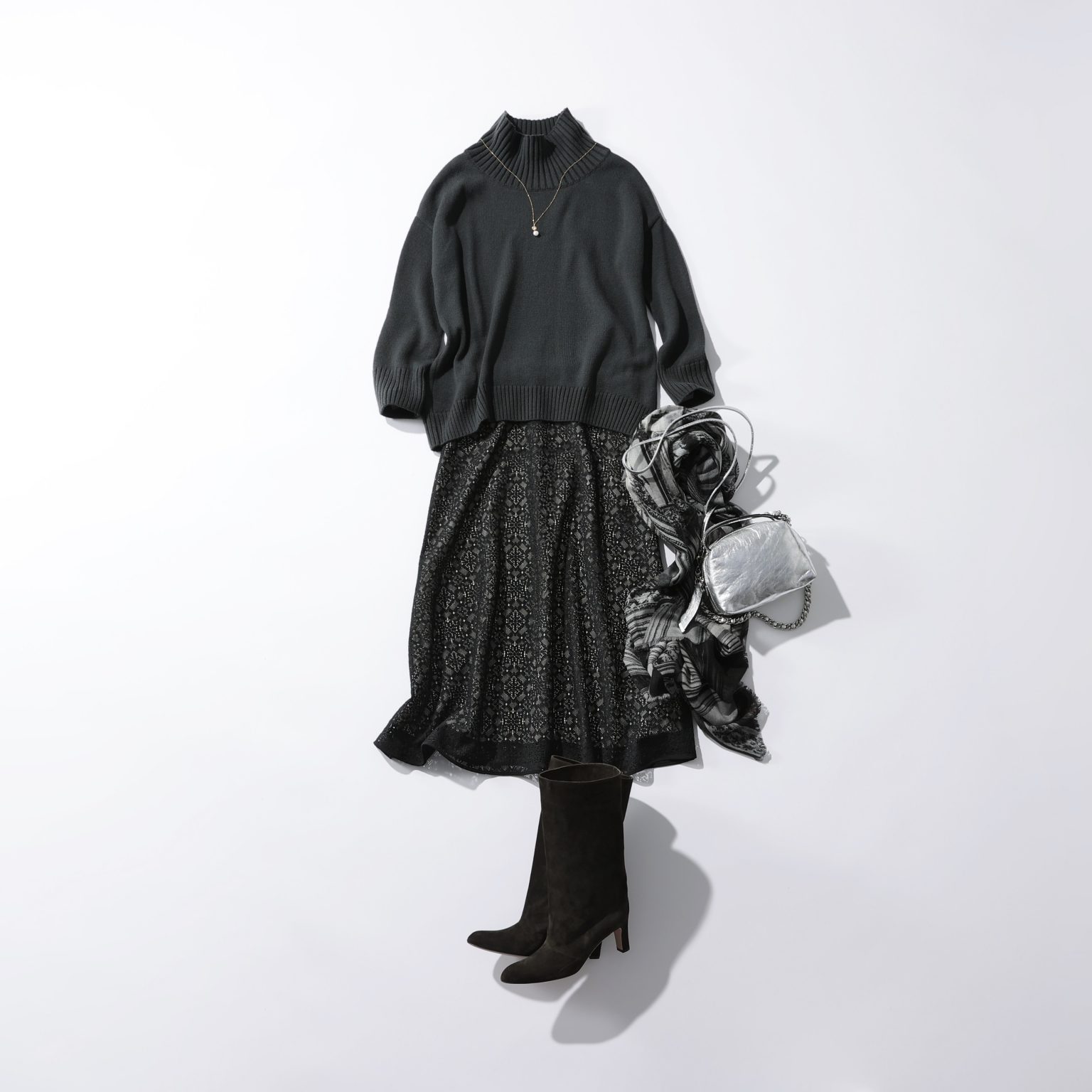 冬らしいボトルネックニットやロングブーツなどボリューミーなアイテムはワントーンコーデにするとすっきり見えます。スカートはレース素材。ダークコーデにほのかな透け感がポイント。