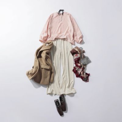 淡いくすみピンクのブラウス×白いワイドパンツ。淡色コーデにベージュのジャケットコートを合わせて。プリントスカーフがアクセント。