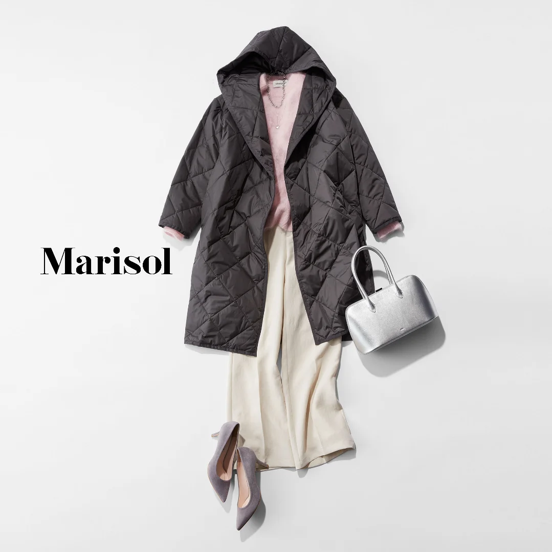 ベビーピンクのふわふわニットにきれいめパンツの冬コーデ。今季も人気のキルティングコートと。