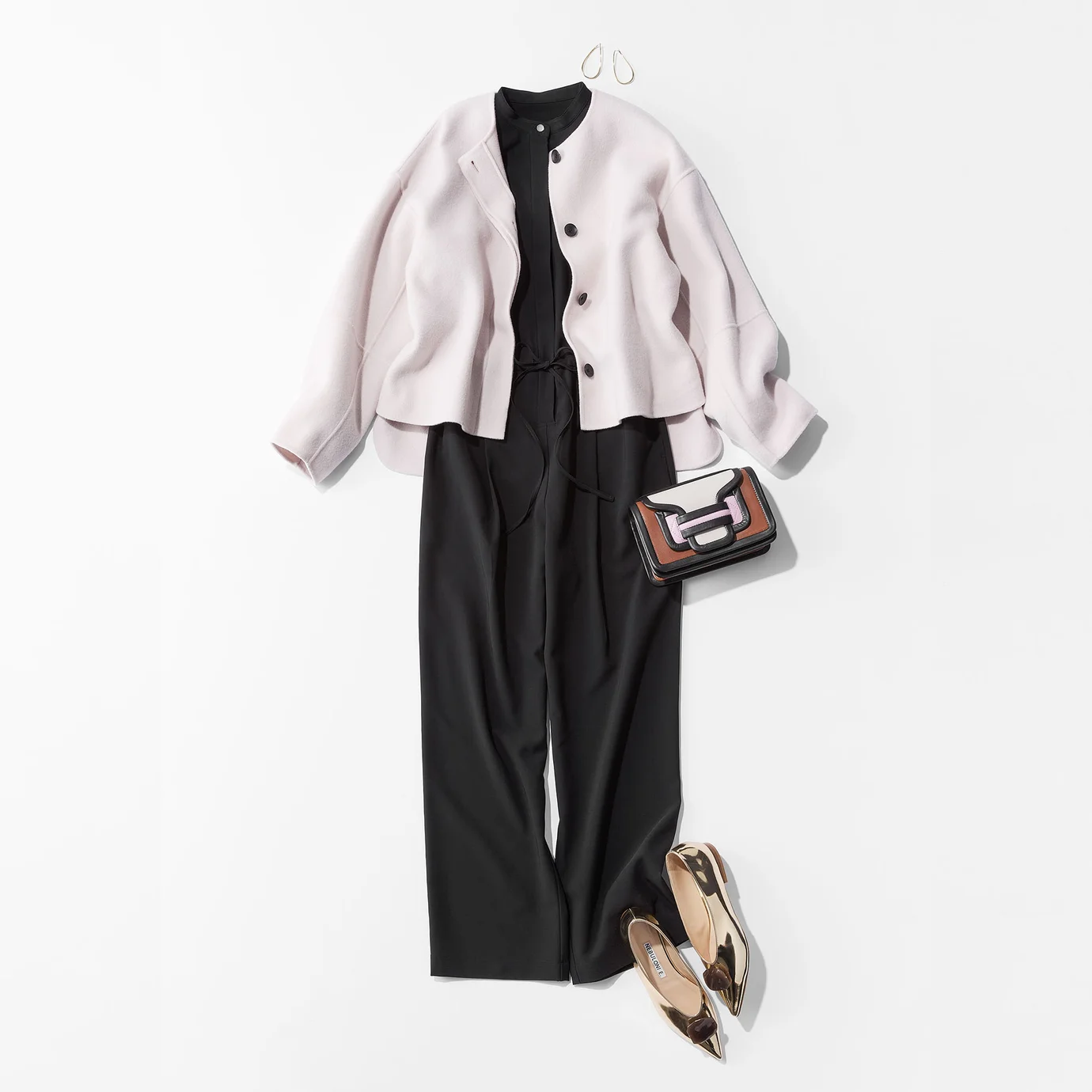 淡い淡い、ベビーピンクのショートコートが主役のコーデ。黒のオールインワンがコートを引き立てます。