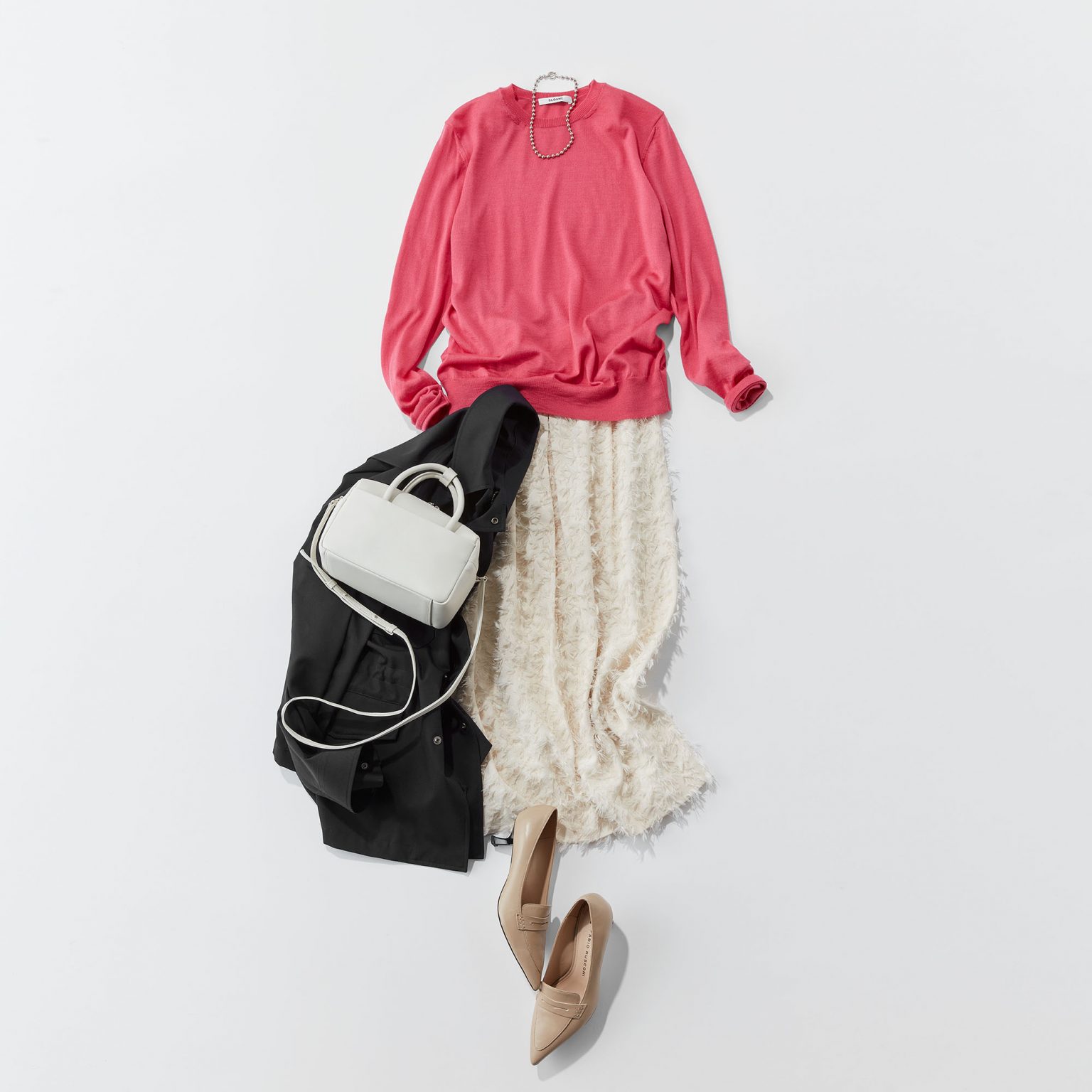 シンプルなクルーネックのフューシャピンクニットにトレンドのシャギースカートの華やかコーデ。甘さのバランスがちょうどいい♡