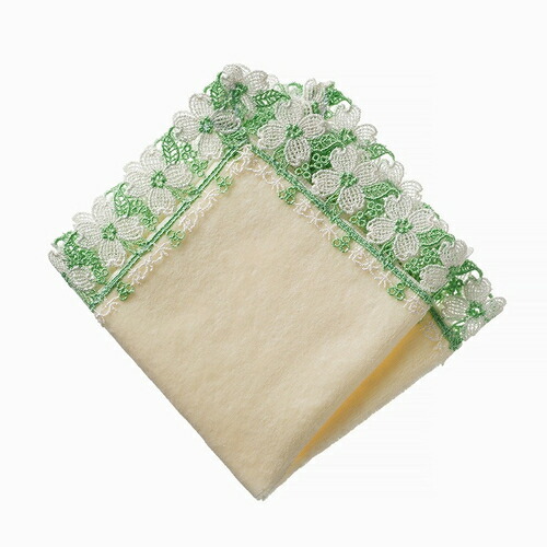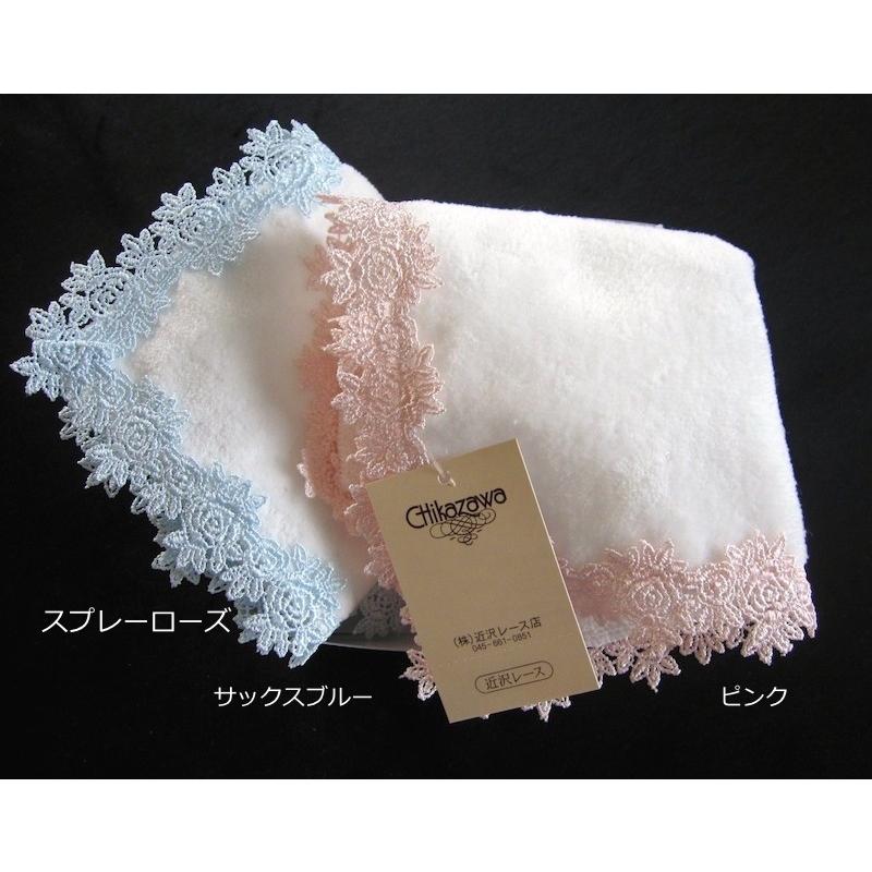 枝分かれした薔薇(=スプレーローズ)のデザインが上品な定番タオルハンカチ。ふわふわなタオルに可憐なレース、近沢レース店の永遠の定番です。