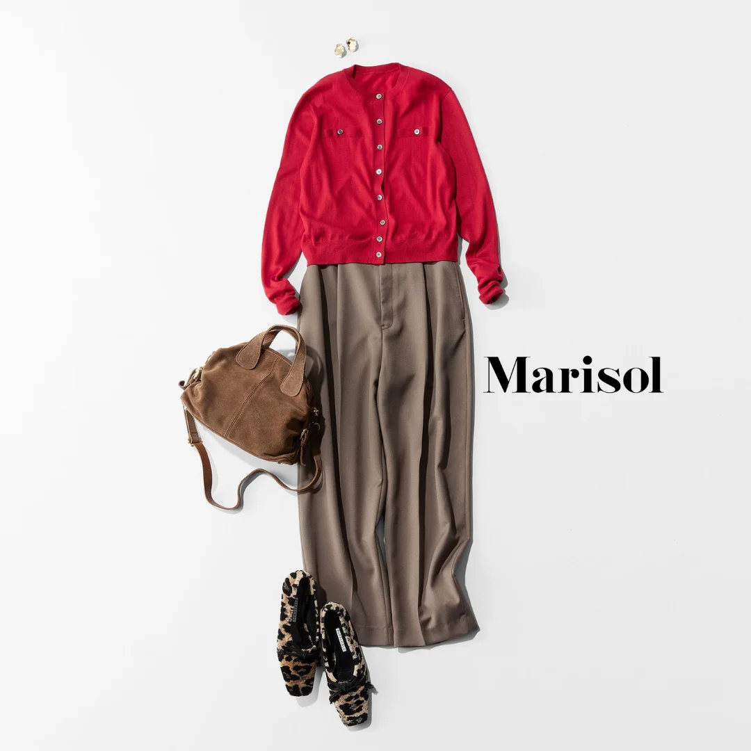 相性抜群の組み合わせ、赤のきれい色ニット×ベージュのワイドパンツコーデ。レオパード柄シューズがアクセント。
