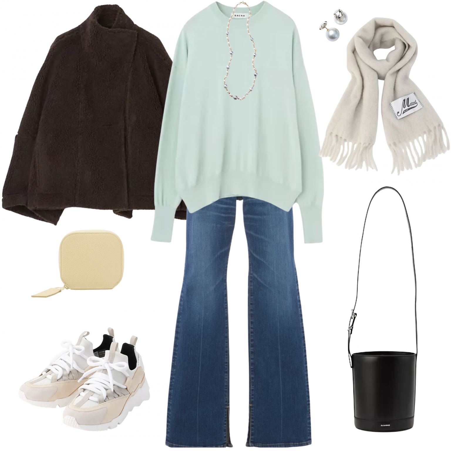 爽やかなライトグリーンのクルーネックニット×デニムコーデ。ゆったりとしたシルエットでリラックス。