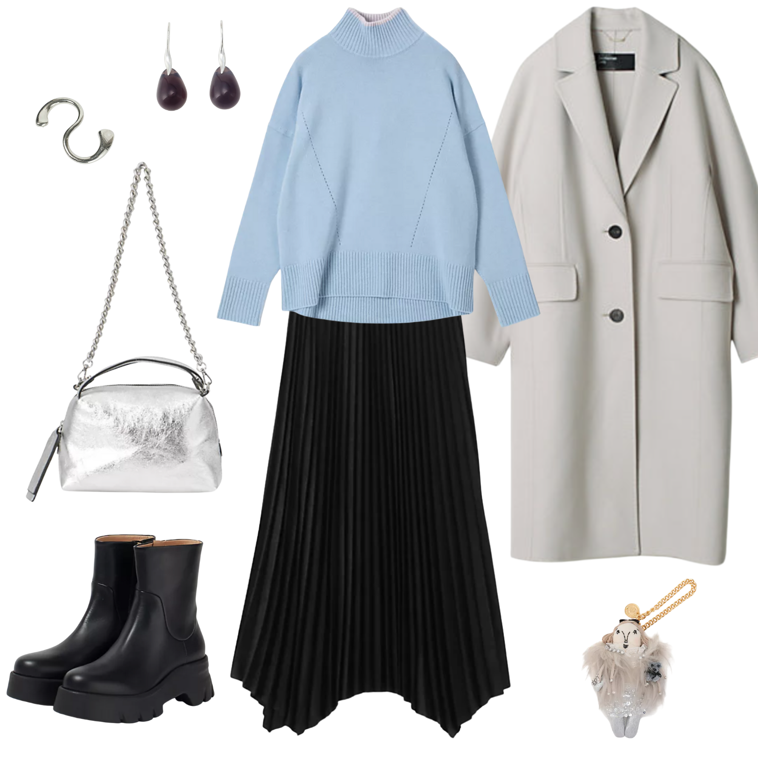 カシミヤ100%のブルーのハイネックニット×アシメスカートの冬コーデ。アイスグレーのコートがいい感じ♡