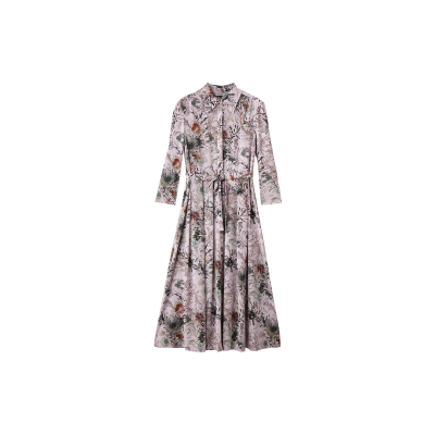 くすみピンクに花柄がモダンなCORCOVADOのウエストリボン付きシャツワンピース。落ち感がきれいなフレアシルエット。